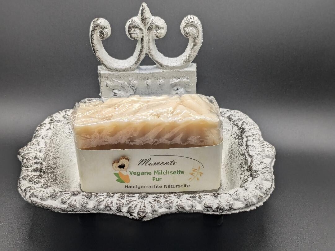 Die vegane Milchseife ist pur, d.h. es wurde hier bewusst auf ätherische Öle verzichtet, um eine Pflegeseife für besonders empfindliche und strapazierte Haut zu haben.